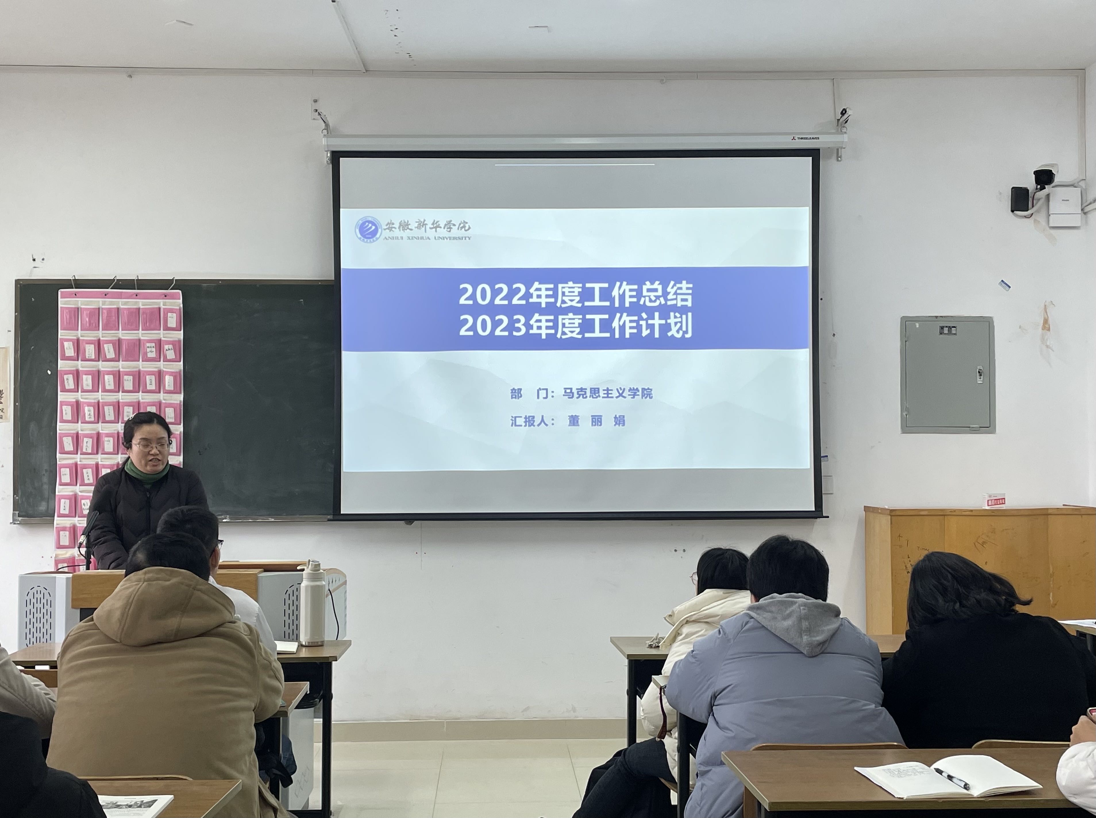 会议首先对上周学校审核评估检查结果向全体教师作反馈。董丽娟传达专家组意见,审核评估检查情况整体较好,学院态度积极蓬勃。但仍存在问题需要改进,马克思主义学院将在特色改革、教案讲稿规范、课程思政、试卷批改等方面进一步改进与优化。此外,董丽娟对2022年度马克思主义学院工作成果及2023年度计划安排进行阐明,以帮助各位教师了解部门情况,要求全体教师再学习、再认识、再提高。