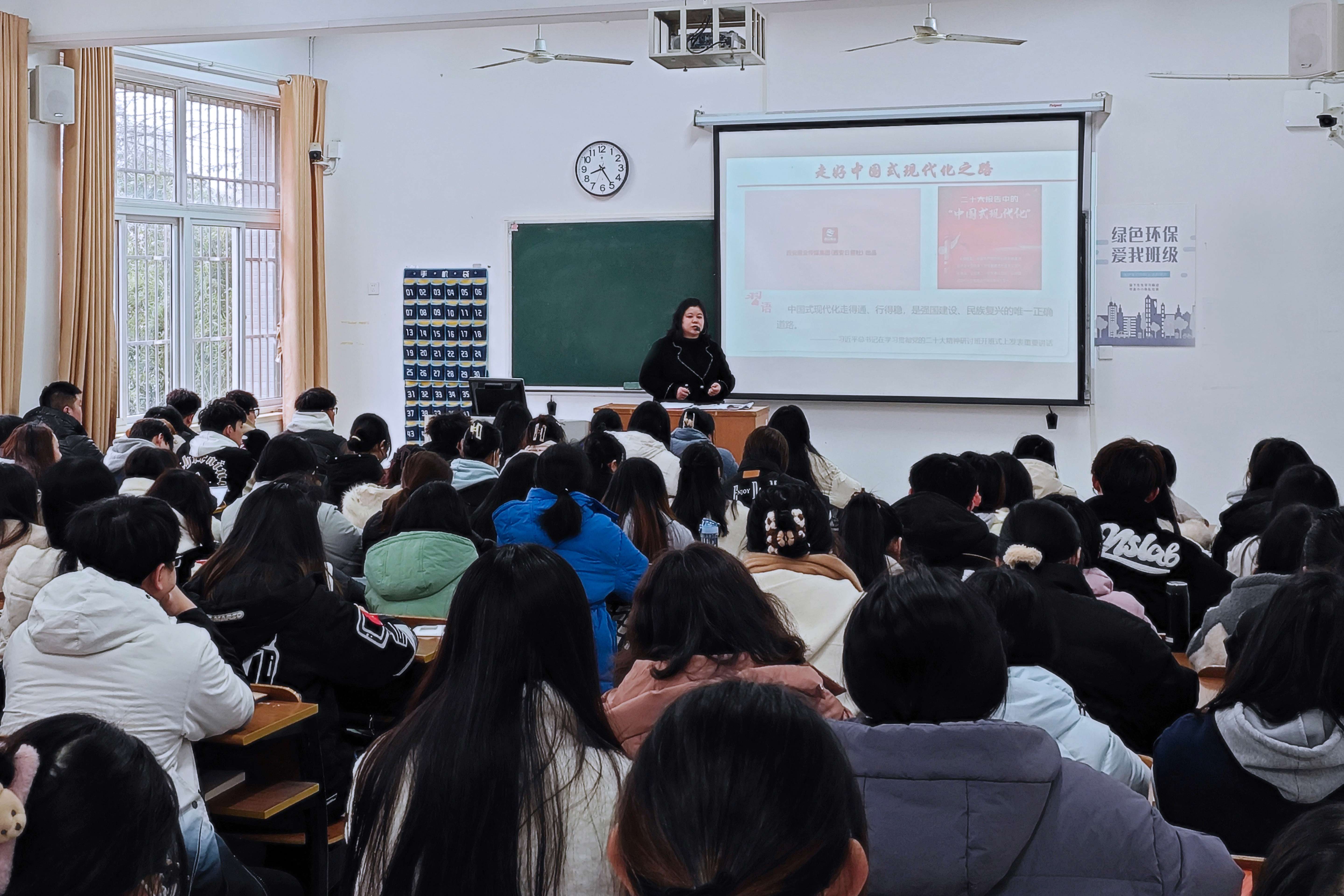 在《毛泽东思想和中国特色社会主义理论体系概论》的课堂,老师们结合习近平总书记在学习贯彻党的二十大精神研讨班开班式上的讲话精神,以“走好中国式现代化之路”为主题,带领同学们充分认识到中国式现代化走得通、行得稳,是强国建设、民族复兴的唯一正确道路。《中国近现代史纲要》课堂以“立志复兴伟业 踔厉奋发前行”为主题,让同学们深刻理解我国发展进入战略机遇和风险挑战并存、不确定难预料因素增多的时期,必须牢牢把握“坚持和加强党的全面领导”“坚持中国特色社会主义道路”“坚持以人民为中心的发展思想”“坚持深化改革开放”“坚持发扬斗争精神”等重大原则,以笃行不怠的战略定力,立志复兴伟业。