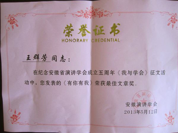 本网讯(通讯员 王群芳)为帮助青年教师了解演讲与口才学学科前沿知识,加强学术交流,开拓学术视野,提高学术水平。5月12日,文化与新闻传播学院选派王群芳老师参加了安徽省第五届演讲学会会议。王群芳老师提交的文章《有你有我》在演讲学会成立五周年《我与学会》征文活动中荣获最佳文章奖。