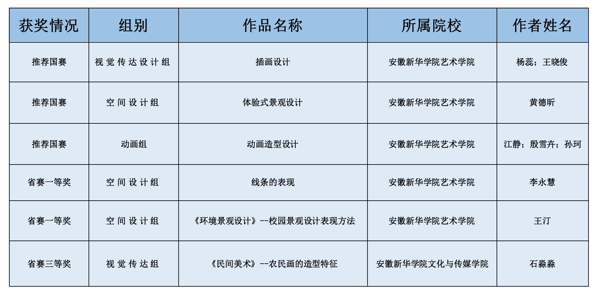 本网讯(通讯员:杨蕊)日前,第六届全国数字创意教学技能大赛(安徽高校赛道)已公布评审结果,安徽新华学院6项作品喜获佳绩,其中,3项作品被推荐至国赛,2项作品取得省赛一等奖,1项作品取得省赛三等奖。