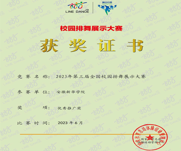本次大赛我校与来自全国各地20个省市300余支队伍近七万名学生同期比拼,我校学生在运动员动作表现、队形变化、视频制作、直播观看素养等方面表现良好,获得了组委会和裁判员的认可,除参赛作品获奖外,组委会还授予安徽新华学院“优秀推广奖”。