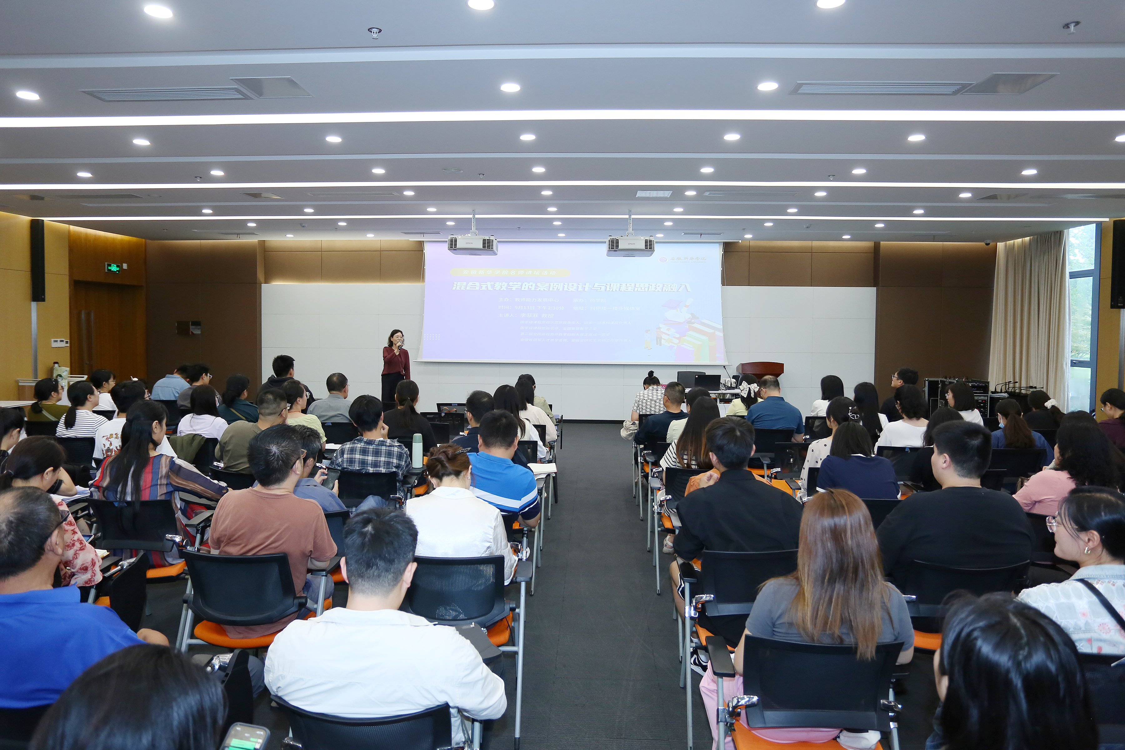 本网讯(通讯员:华芳、程茜)为全面落实立德树人根本任务,推进课程思政建设,提升教师混合式教学能力,9月13日,学校邀请安徽医科大学李菲菲教授开展“名师讲坛——混合式教学的案例设计与课程思政融入”培训活动。本次活动由教师能力发展中心主办、药学院承办。各二级学院系主任、教师代表参加现场培训,同步进行雨课堂线上直播。