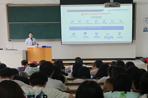 投资顾问浦琪从证券行业现状、发展环境、未来趋势、职业规划四个方面向参会人员介绍了金融市场的大体发展现状,阐述了证券公司的主营业务,为学生介绍了就业方向和前景。浦琪在讲座过程中从学生未来发展角度出发,给同学们提出了很多中肯的建议。