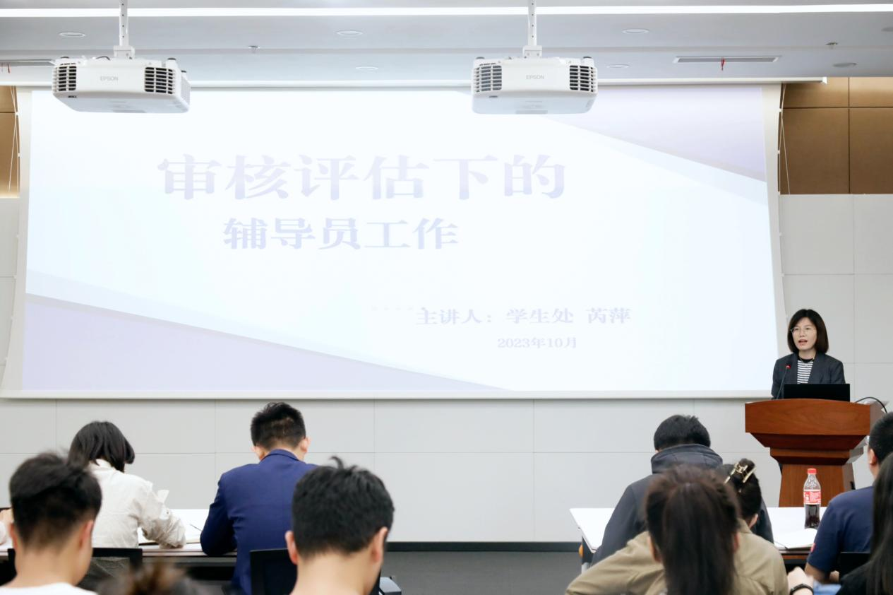 本期培训共涵盖三个子主题,分别是“聚焦审核评估·助力学工发展”、“秋季学期工作实务”、“辅导员说”。第一部分由学生处处长芮萍做《审核评估下的辅导员工作》专题培训,她从审核评估概述、审核评估与学校师生的关系、审核评估下辅导员的主要工作三个方面做了全面的解读与培训,她表示全体学工人员“要以身作则,做好审核评估的宣传和解读、要协同联动,扎实开展学风建设活动、要多管齐下,严抓文明行为养成教育、要广泛宣讲,宣讲学校及学院发展成果、要春风化雨,进一步强化与学生情感培养、要强化服务,稳步提升学生在校满意度、要防控舆情,弘扬正能量抵消负能量、要守住底线,确保安全稳定不动摇”,培训内容兼具系统性与针对性,她鼓励全体学工人齐心协力、携手并进,以饱满的热情和积极的状态在迎评工作中发挥学工人的力量。