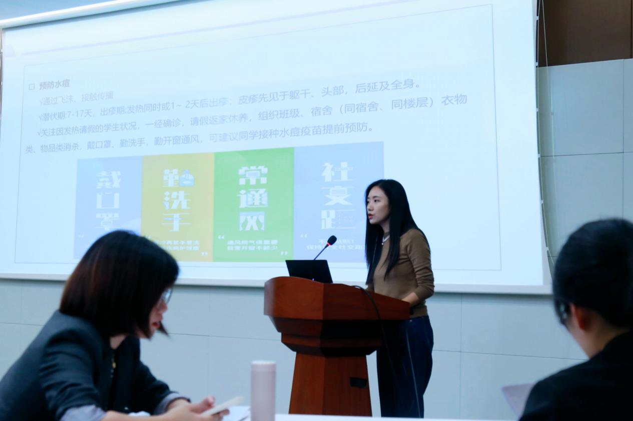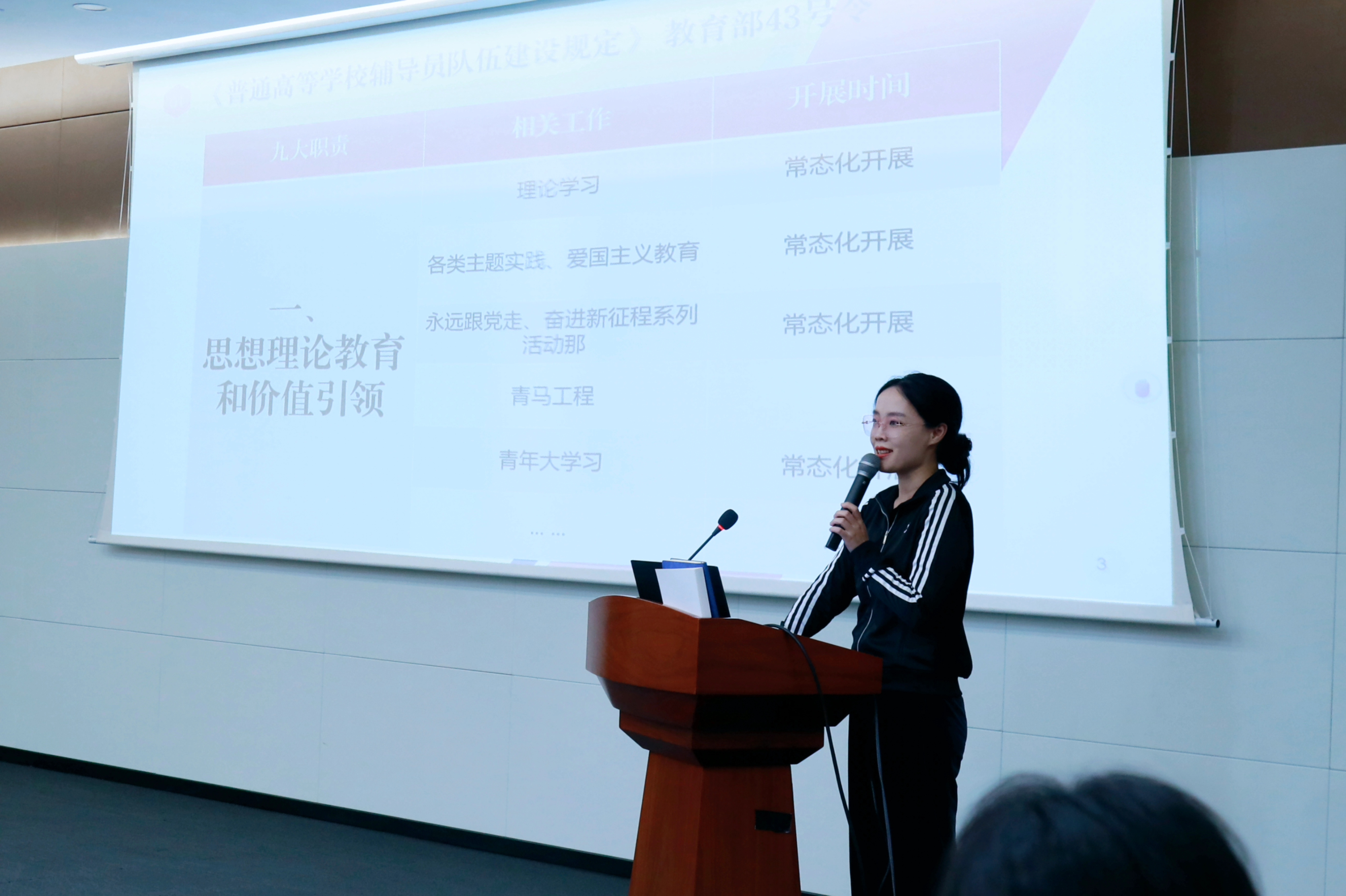 结合秋季学期学生工作特点,第二部分安排了《秋季学期工作实务》专题培训,由学生处何倍做《秋季传染病防治工作要点》主题培训,她从《中华人民共和国传染病防治法》、《突发公共卫生事件应急条例》等国家相关文件解读、我校近年相关数据分析及校园传染病防治与报告处理流程等方面做了细致具体的讲解,强化全体学工人员的安全工作意识,促进平安校园、健康校园建设;随后,校团委书记计羚做《秋季学期共青团重点工作》主题培训,她结合教育部43号令,普通高等学校辅导员队伍建设规定中辅导员九大工作职责,对应介绍辅导员在共青团工作中的职责及学校共青团工作要点提示与部署。