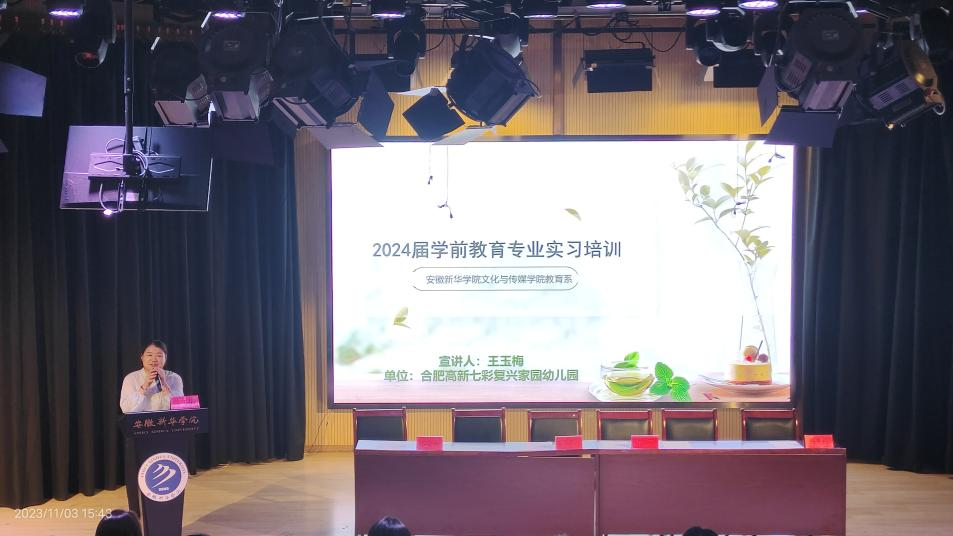 本网迅(通讯员:孙原)为了使同学们充分认识到毕业实习的重要性,确保毕业实习工作顺利开展,文化与传媒学院于11月3日下午在教八演播厅召开2024届学前教育专业毕业生实习动员大会。文化与传媒学院院长助理刘雪、学前教育专业教授马广柏、教育系副主任林斗秀、合肥科学家园幼儿园园长袁雅丽、合肥高新七彩复兴家园幼儿园园长王玉梅、学前教育专业老师及24届学前教育毕业生出席本次会议。会议由林斗秀主持。