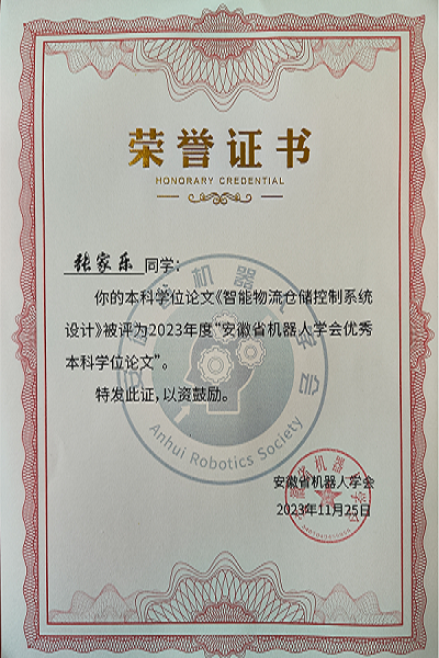 本网讯(通讯员:白志青)近日,安徽省机器人学会公布了《2023年安徽省机器人学会优秀硕士学位论文、优秀本科毕业论文(设计)评选结果》。在与中国科学技术大学、合肥工业大学、安徽大学等省内知名高校同台比拼中,电子工程学院/智能制造学院张家乐同学的毕业论文《智能物流仓储控制系统设计》以及杨星卓同学的毕业论文《基于WiFi控制的智能“防疫卫士”的设计与实现》均荣获2023年安徽省机器人学会优秀本科毕业论文,指导教师纪利琴及史道玲均荣获2023年安徽省机器人协会优秀指导教师称号。