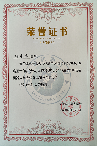 我校学子毕业论文获评2023年安徽省机器人学会优秀本科毕业论文