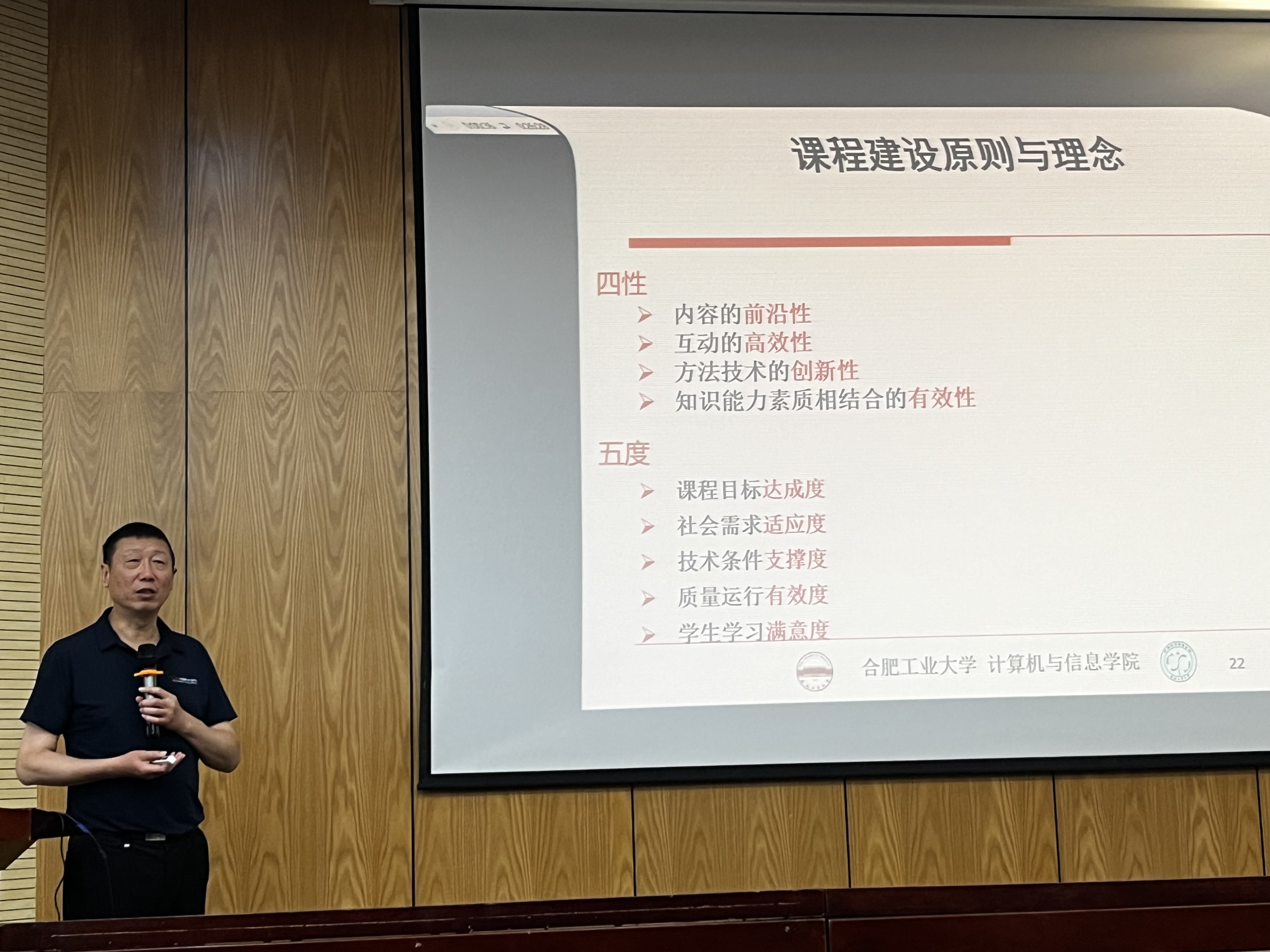 合肥工业大学计算机与信息学院教授、博士生导师、安徽省教学名师、中国工程教育认证专家王浩教授就课程建设的内涵和方法进行报告。王教授从国家级课程建设之路出发,介绍了国家精品课程、国家一流本科课程等课程的建设内容。随后王教授介绍了课程建设的原则与理念,强调要“以学生为中心,面向产出教育,持续改进”。之后王教授详细介绍了在课程建设过程中所存在的问题并分析了原因,同时还讲解了在课程建设的各个环节中教师们应当如何去做,才能更好促进课程建设。最后,王教授介绍了课程思政的相关要素并结合自身授课经验详细讲解了如何在课程中巧妙地融入课程思政内容。