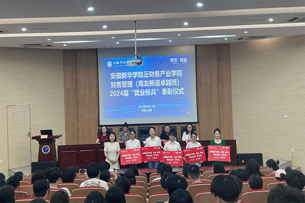 本网讯(通讯员:刘丹艳)6月13日上午,我校云财务产业学院财务管理(用友新道卓越班)2024届“就业标兵”表彰仪式在学术报告厅举行。出席表彰仪式的领导有新道科技股份有限公司人才运营华南区总监张小茹、安徽分公司副总经理康阿朋,财会与金融学院执行院长濮明月,副院长张璐、彭智,2020级部分学生代表及2021级财务管理(用友新道卓越班)全体学生参加了表彰仪式。