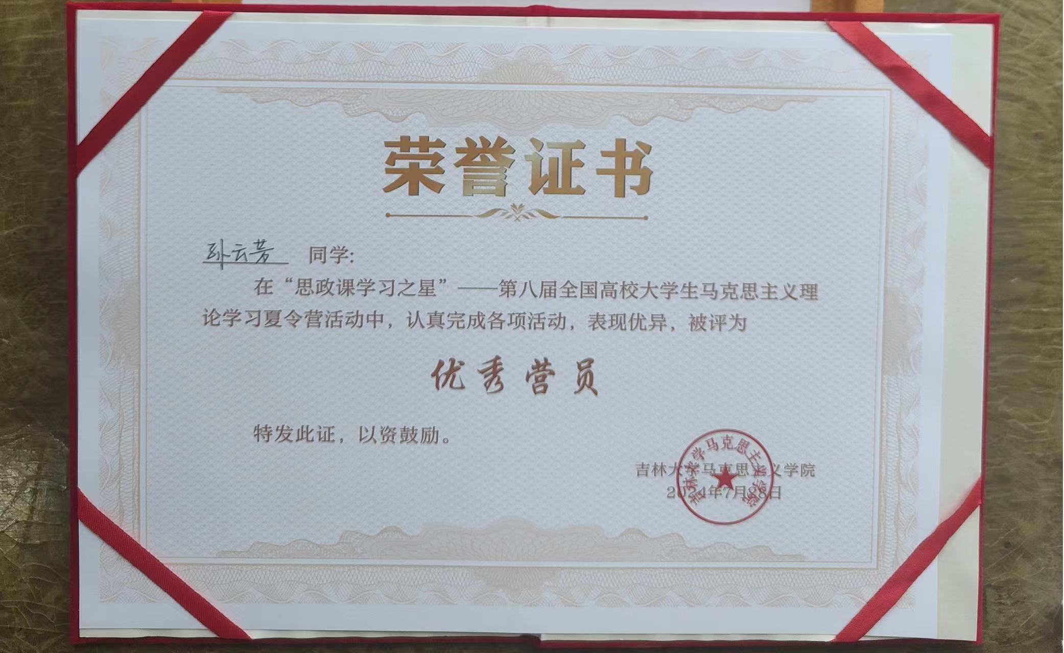本网讯(通讯员:孙云芳)为深入学习贯彻落实习近平总书记关于学校思政课建设的重要指示,全面落实新时代学校思政课推进会精神,守正创新推动思政课建设内涵式发展,不断提高思政课的针对性和吸引力,第八届全国高校大学生马克思主义理论学习夏令营活动于7月21日至28日在吉林省长春市成功举办。本次活动由教育部高校思政课教学指导委员会主办,吉林大学承办,“青梨派”、全国“大思政课”实践教学数字地图协办。经安徽省教育厅遴选推荐,我校小学教育1班孙云芳同学获参营资格并荣获“优秀营员”称号。