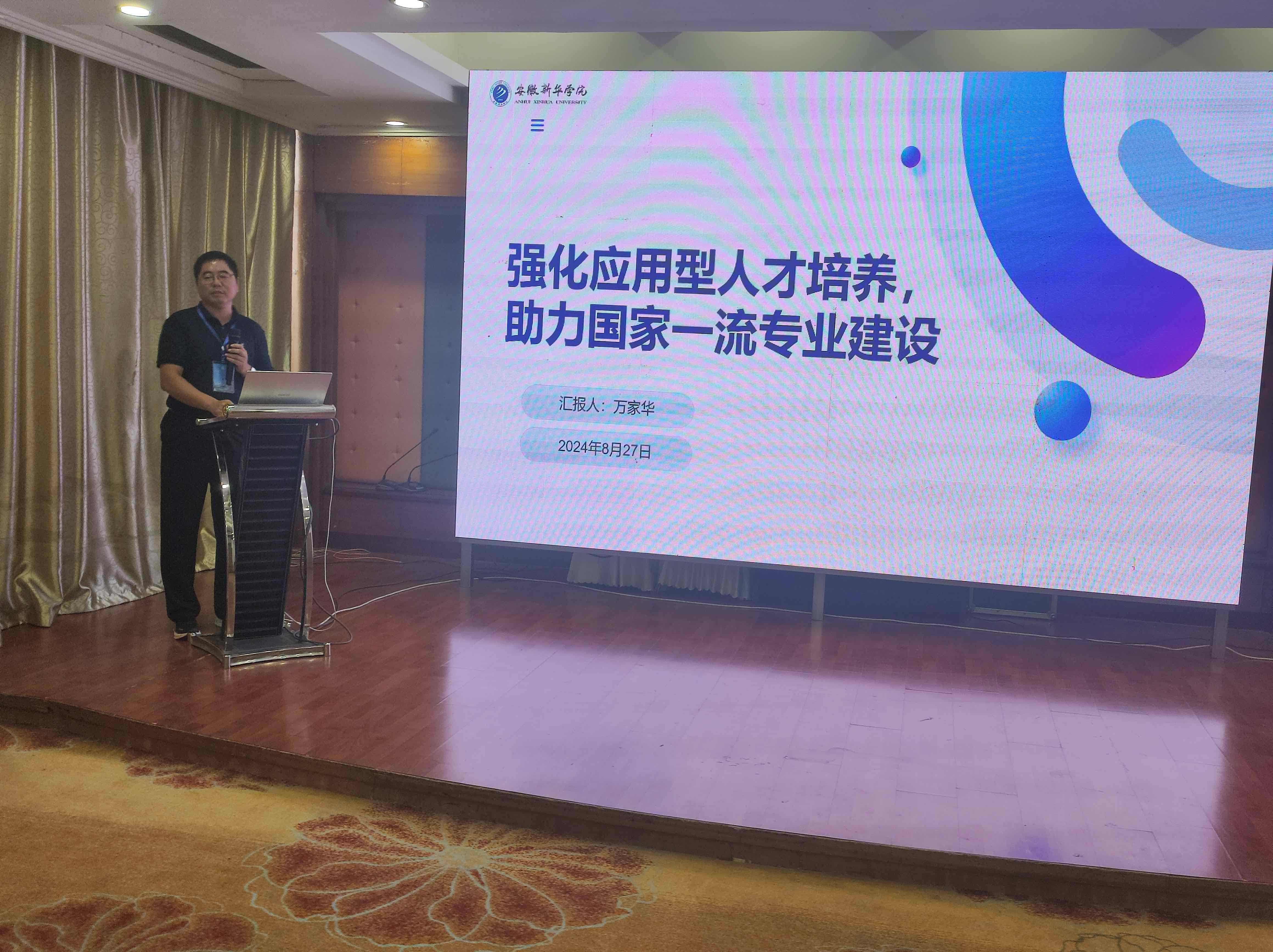 在会上,万家华做了题为“强化应用型人才培养,助力一流专业建设”的报告。他首先向与会人员介绍了安徽新华学院以及大数据与人工智能学院的基本情况;然后详细介绍了安徽新华学院软件工程专业建设情况,主要包括构建“3+1”教学模式、强化实践环节、实施“321”人才培养举措,注重创新与实践,新修订人才培养方案,紧跟行业趋势,丰富第二课堂,提升学生综合素质,同时还介绍了如何加强师资建设、深化校企合作、提升教科研项目数量及质量,助力专业高质量发展;最后也汇报了在专业建设过程中还存在的不足及下一步计划。