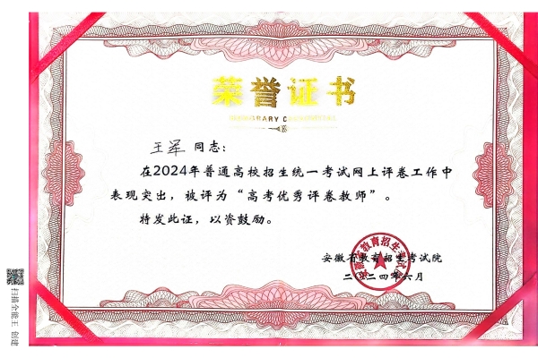 本网讯(通讯员:王军(数))6月11日至22日,安徽省2024年普通高考数学科目网上评卷工作在安徽建筑大学顺利进行。我校通识教育部教师王军(数)受邀参加此次高考数学科目网上评卷工作,经过13天的紧张工作,王军(数)老师凭借严谨的工作态度和专业的评卷水平,荣获“高考优秀评卷教师”称号。