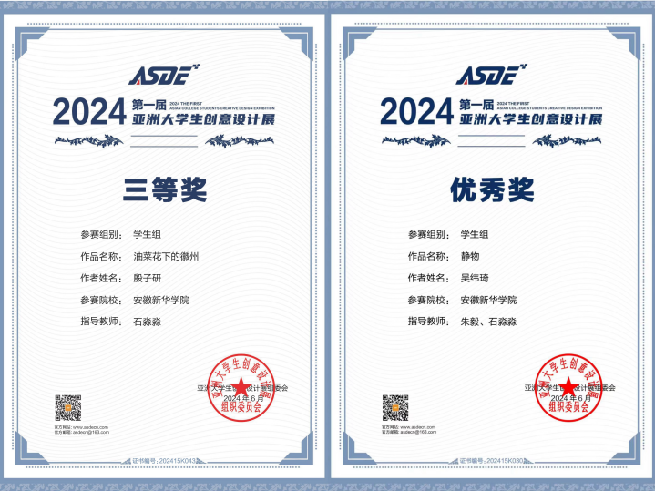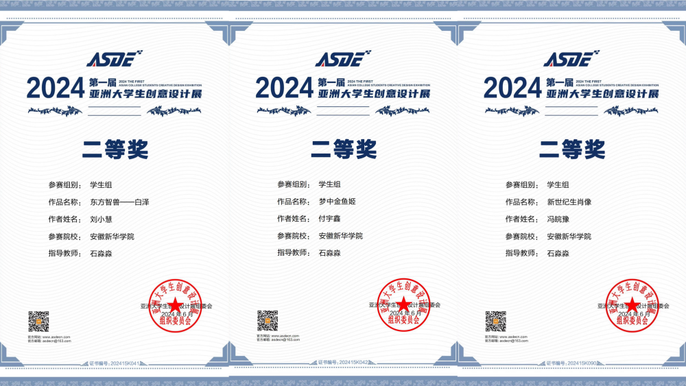 由亚洲大学生创意设计展组委会主办的2024第一届亚洲大学生创意设计展,面向亚洲国家的专业设计师、设计机构、以及各高校师生开放作品征集投稿,旨在搭建亚洲国家展示艺术、设计学科的国际化交流学习平台,此次赛事汇集了503所海内外高校与企业共4088件作品参赛。其中我院石淼淼老师指导的刘小慧、付宇鑫、冯皖豫三位同学均荣获二等奖,殷子研同学荣获三等奖。朱毅、石淼淼老师指导的吴纬琦同学荣获优秀奖。