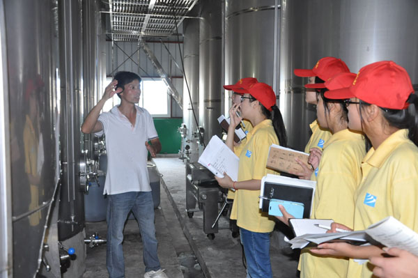 南溪镇余山村的返乡创业青年余品山,利用在外打工学到的技术回乡带领村民种植葡萄并创办恒昌葡萄酒业有限公司。在他的带领下,村民们种植的葡萄园在逐年扩大,收入逐年增加。去年实践队就以他为典型,专门开展了返乡农民创业的专题调研。 如今他的酒厂已经建成投产,并且注册了“余山红”商标。大家认真听取了余品山回乡创业带动村民共同致富的经历,走入田间地头查看葡萄种植情况,了解当地葡萄加工、销售等情况,并在新建的厂房参观了葡萄酒的生产过程。在为新型农业给农民带来的实惠感到由衷喜悦的同时,也被这位山区农村青年坚韧不拔的创业经历深深的打动。