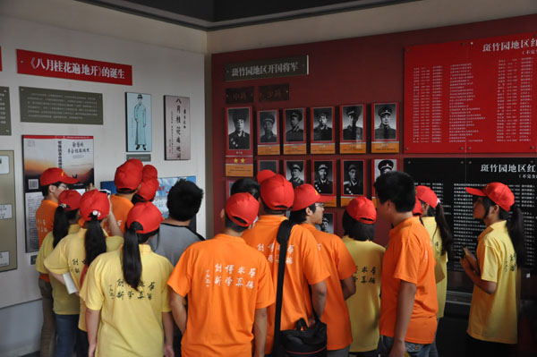 金寨县地处皖西边陲、大别山腹地,也是我国第二大将军县,是著名的革命老区,有着丰富的红色文化资源。在开展各项调研工作的同时,实践队也开展了“走访红色足迹”活动。在当地政府的协助下,队员们参观了南溪镇丁埠村的大王庙立夏节起义旧址,请老党员讲金寨县在第二次国内革命战争期间的故事;在斑竹园镇的刘邓大军指挥部旧址,一幅幅战争期间的画面让大家看到了革命先辈们为了民族解而放浴血奋战的场景;在沙堰村,实践队员们参观了长岭关服务区烈士陵墓,欣赏了词作者罗银青后人演唱的革命歌曲《八月桂花遍地开》,透过淳朴的歌声,大家感受到这首歌曲在革命战争年代鼓舞人民,团结群众,掀起革命高潮中产生的积极效应。