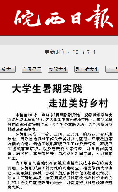 此次赴金寨县暑期“三下乡”活动得到了南溪镇政府、团委、环保执法局、文化站等部门的大力支持和配合。金寨县电视台、皖西日报等多家主流媒体也高度关注,金寨先锋网、安青网、六安网、六安新闻网、皖西日报、村游网、大别山百姓网、徽乡网等均对活动过程进行了报道。同时,实践队员们也通过微博、QQ、BBS等新媒介进行实时播报,受到了广泛关注,社会反响良好。