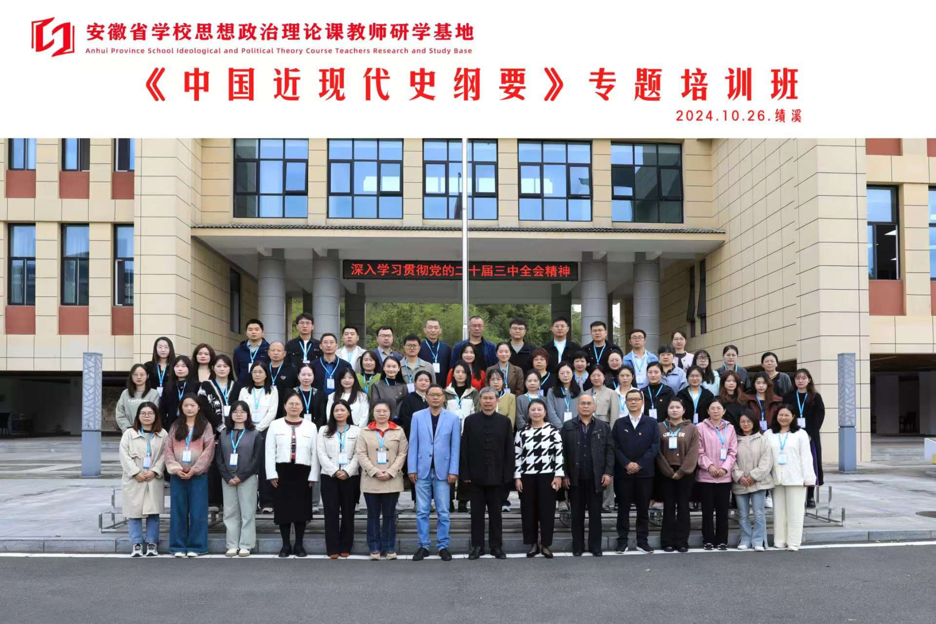 本网讯(通讯员:江建红)为进一步贯彻落实习近平总书记在学校思政课教师座谈会重要讲话精神和考察安徽重要讲话精神,坚持用党的创新理论铸魂育人,聚焦立德树人根本任务,推进“大思政课”和大中小学思政课一体化建设工作,提升思政课教师职业素养和专业能力,2024年10月25日至29日,由安徽省委教育工委主办,安徽省学校思想政治理论课教师研学基地(安徽财经大学)承办的“中国近现代史纲要”课程专题培训班在绩溪顺利举办。全省60多名教师参加了培训会,我校马克思主义学院“纲要”教研室教师江建红、王文慧参加了此次培训学习。
