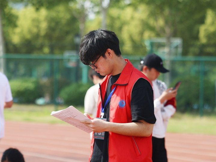 24 新闻本 1 班的张滢身兼运动员与志愿者,上午参加完女子八百米比赛,下午便投身参与教职工实心球项目的现场维护:“虽然没获奖,但我为实心球比赛的顺利进行贡献了力量,也传递了志愿者的精神。”
