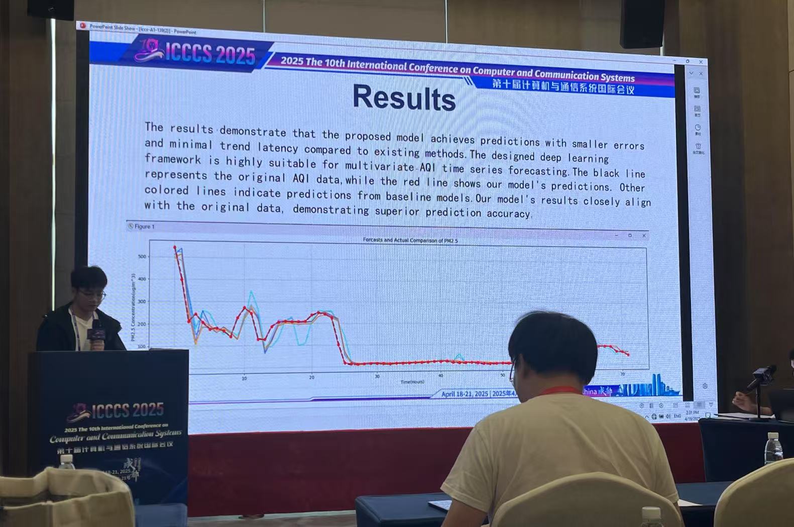 在“智能环境感知与预测”分论坛中,我校大数据与人工智能学院李王建同学代表网络与信息系统软件实验室,作了题为《基于NLSTM的多任务空气质量预测模型》的学术报告。该研究创新性地将神经逻辑网络与长短期记忆模型相结合,在空气质量多指标联合预测任务中取得突破性进展,现场与悉尼科技大学、早稻田大学等国际团队进行了深入的技术探讨。
