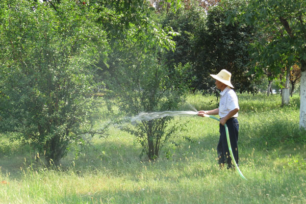 自7月份以来,环境建设处就及早做好养护工作安排。组织专业工程师对一线养护人员进行夏季苗木养护等方面的知识教育,合理安排浇灌时间,尽量采用校园湖水、绿化取水口等水源进行绿地日常灌溉,以降低绿地用水成本。环境建设处工作人员对苗圃内古银杏、香樟、桂花等贵重乔木进行挖穴浇水,发挥蓄水圈在植物根部的蓄积作用,保证水分能有较长时间渗透到土壤中。