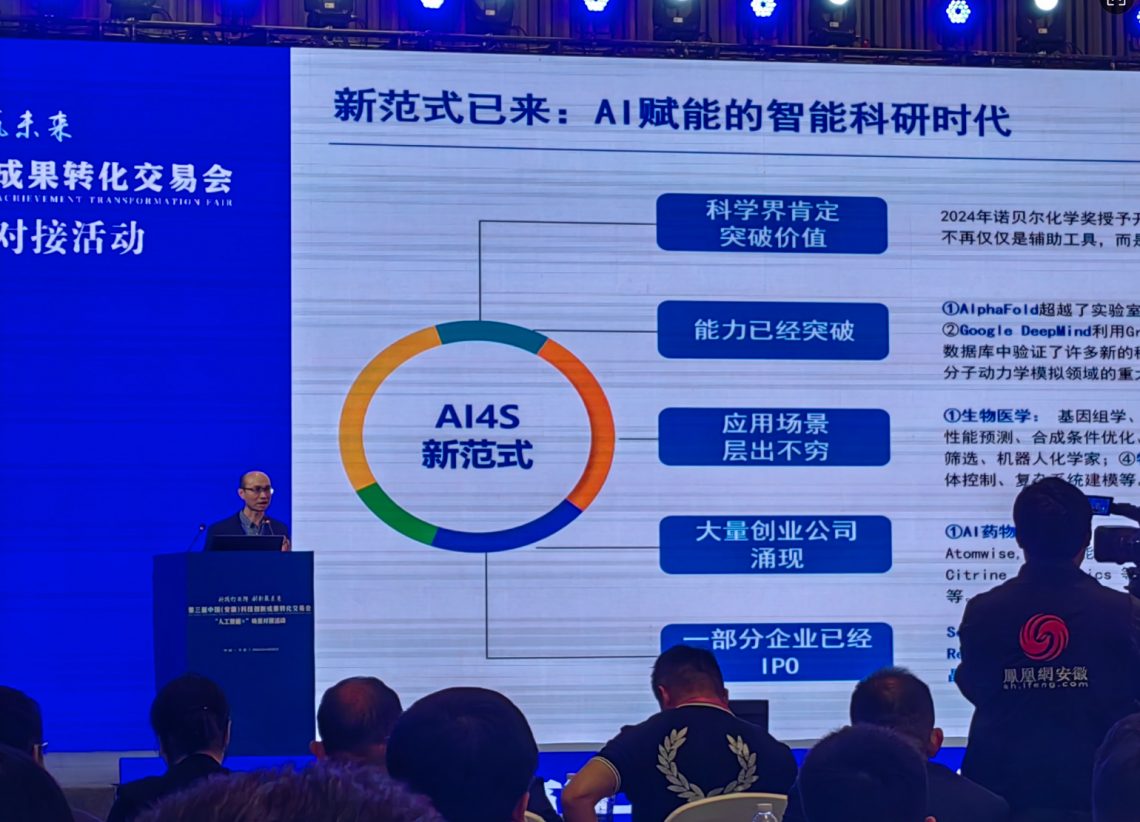 在主题演讲环节,北京市长城企业战略研究所副总经理黄波以《AI for Science——科研的新范式、新赛道和大变革》为题,探讨人工智能如何重构科学研究方法论。