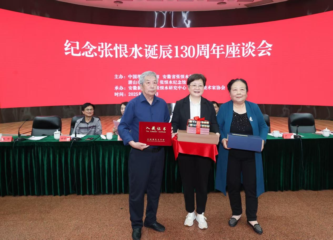 张恨水子女张正、张同深情回忆过往,代表亲属向中国现代文学馆捐赠张恨水手稿、书籍和生前用品,中国现代文学馆副馆长计蕾接受捐赠,并颁发入藏证书。