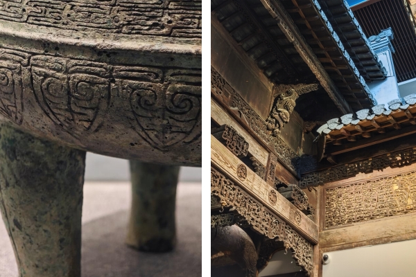 在博物院常设展区《安徽文明史陈列》和《徽州古建筑》中,师生们重点观摩了新石器时代玉器陶器的自然纹样、汉代画像砖石的园林场景、徽州古建筑模型及水口园林复原场景。李硕老师结合展品,详细讲解了古代纹样的抽象化表达、徽派建筑的空间布局与生态智慧,启发学生思考传统元素在现代景观设计中的转化与应用。赵文君老师则从建筑学角度,分析了天井、马头墙等结构的微气候调节功能,并对比了传统水口园林与现代公共空间的设计差异。