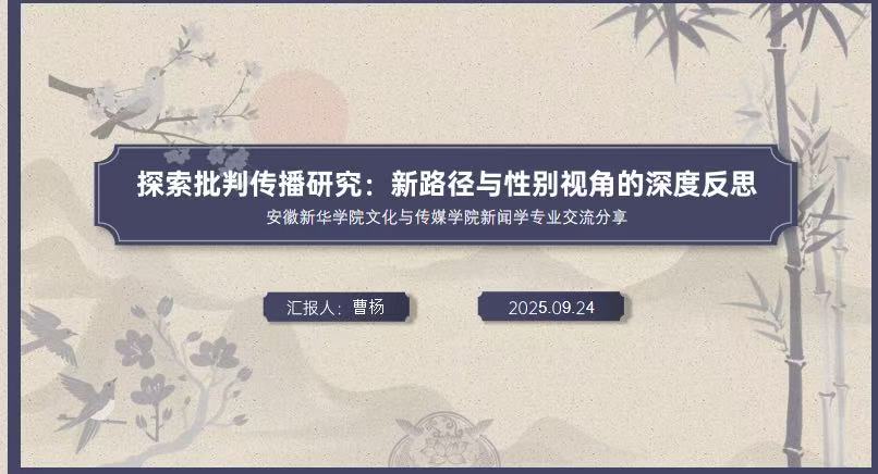 本网讯(通讯员:曹杨)2025年9月24日,安徽新华学院文化与传媒学院新闻学专业在教8-103开展了以“探索批判传播研究:新路径与性别视角的深度反思”为主题的学术研讨会,新闻学专业教师、圣彼得堡国立大学媒介传播与新闻学博士候选人曹杨,结合此前参与复旦大学第十四届 “新媒体与全球信息社会的公正传播” 研究生暑期学校的学习经历作专题汇报。曹杨老师此次参训不仅获得与国际学者、全球青年研究者对话的契机,更围绕暑期学校 “批判传播研究新路径” 核心主题,积累了数字监控、传播劳动、社交媒体批判、数字公地等前沿议题的深度认知。新闻学全体教师共同参会,围绕汇报内容展开深入研讨。