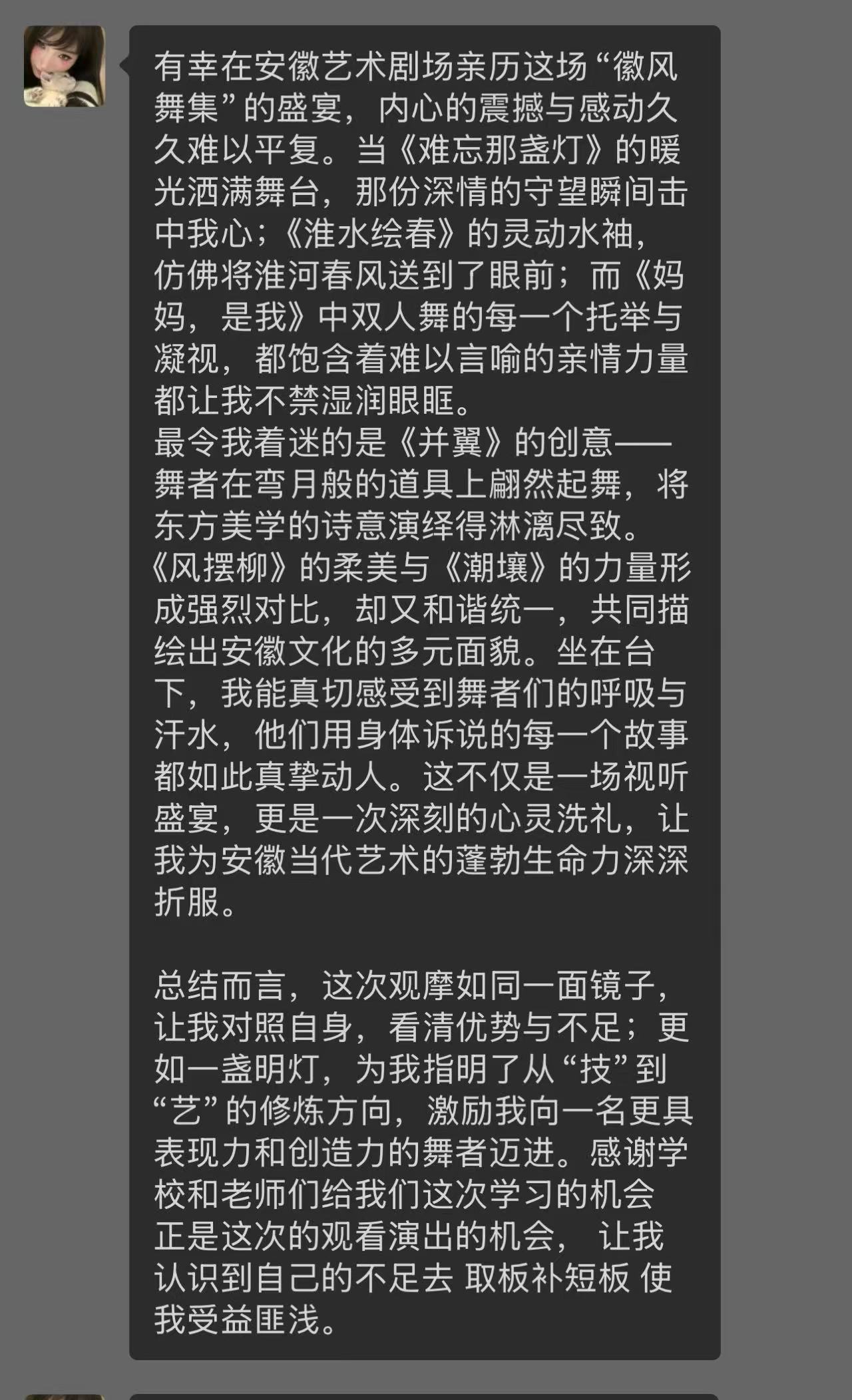 此次观演活动是安徽新华学院艺术学院践行"实践育人"理念的生动实践,既让师生们深度领略了徽风皖韵的文化底蕴,也为表演专业的教学与创作注入了新的灵感。未来,学院将持续搭建此类实践交流平台,推动课堂教学与艺术实践深度融合,助力学子在传承文化、锤炼技艺中成长为高素质艺术人才。