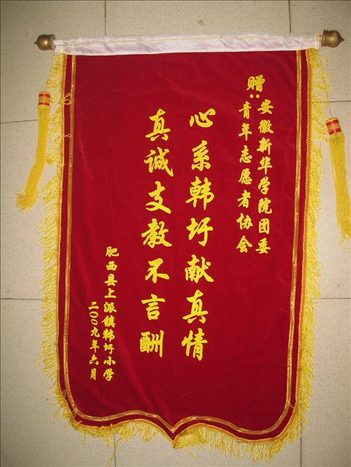 日前,肥西县上派镇韩圩小学给校团委青年志愿者协会送来锦旗,上面写着“心细韩圩献真情,真诚支教不言愁”。这是对我院青年志愿者协会刚刚圆满结束的“和谐阳光,快乐成长”为主题的支教之行的表彰和鼓励。我校青年志愿者协会一直秉承尽己所能,不计报酬,帮助他人,服务社会,实践志愿精神,传播先进文化,为建设团结互助,平等友爱,共同前进的美好社会贡献力量的志愿精神,践行着志愿事业。