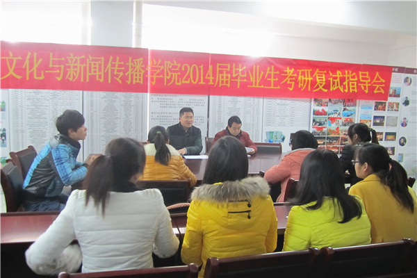 会上,谢昭新对文化与新闻传播学院2014届毕业生考研初试结果予以肯定,并提出建议,要求同学们详细了解报考院校的招生动态和复试安排,结合报考院校复试的不同特点有针对性地做好复习准备;刚刚上线或接近分数线的同学一方面要认真准备所报考院校的复试,另一方面要主动出击尽早联系调剂院校。最后他希望同学们珍惜学习机会,认真学习。