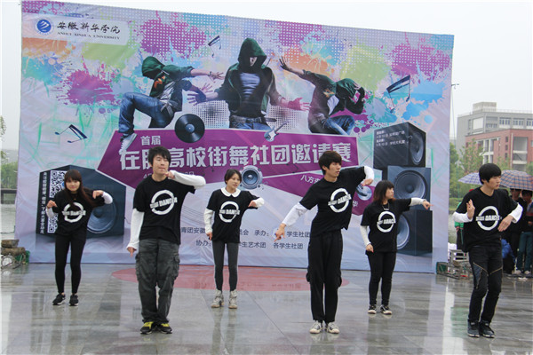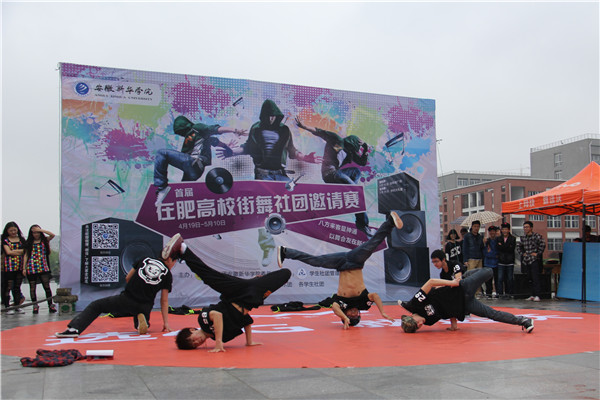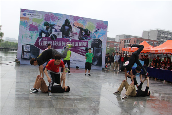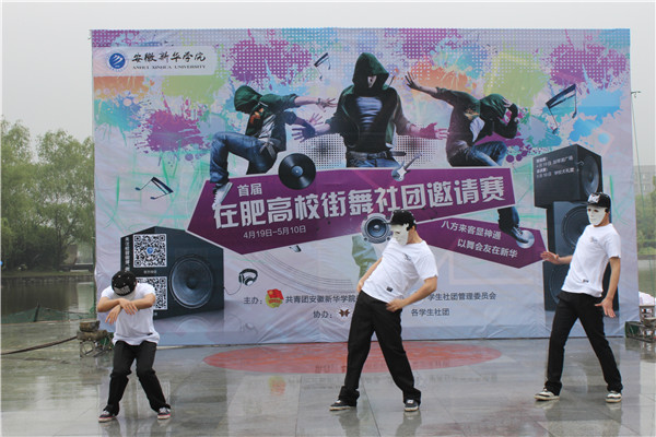 本网讯(通讯员 洪威 学生记者宛琼、焦婧)4月19日下午,首届在肥高校街舞社团邀请赛在我校如琴湖广场举行。中国科学技术大学、合肥工业大学、安徽大学等17所高校23支队伍参加了比赛。合肥工业大学、中国科技大学、安徽大学江淮学院、安徽新华学院、安徽大学等14支代表队伍进入了决赛。高校社团街舞邀请赛的总决赛将在5月中旬举行。担任本次比赛的评委有国家体育总局街舞中级教练员、世界街舞大赛8强、热舞会高级导师郝震宇,中国达人秀安徽赛区冠军管研,全国街舞挑战赛亚军、合肥桥梁舞团团长博成。