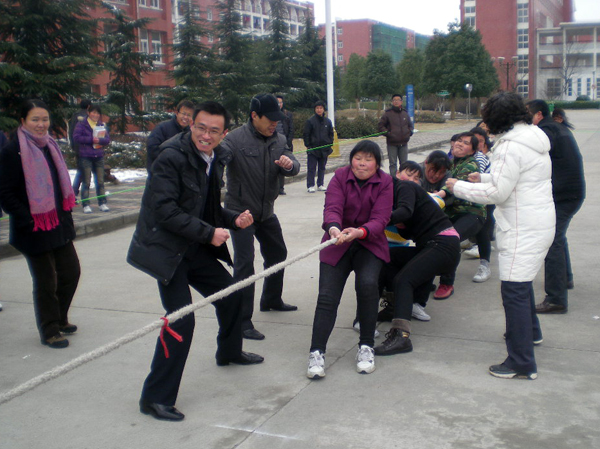 今年女子拔河比赛冠军争夺尤其激烈,3月9日中午,总务处、资产处和商学院联队与学生处、团委联队会师决赛。两队负责同志也来到了比赛现场,亲自上阵组织,加油助威。随着裁判哨声响起,双方队员拼尽全力向后拉,由于双方总体实力接近,最后一局僵持了一分多钟还未见胜负。总务处、资产处、商学院联队队员但仍然不肯轻易放弃,坚持不懈,抓住机会顺势拉倒了学生处、团委联队,最终取得了这样一场来之不易的胜利。(总务处)