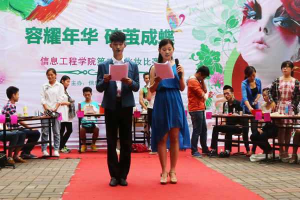来自信息工程学院各个年级的17位学生化妆师按照规则要求,在半个小时的比赛时间里精心装扮着他们的搭档。比赛中还穿插才艺展示、绕场走秀等精彩环节。别出心裁的创意妆容,让个性与青春相得益彰。比赛现场用与众不同的新意,吸引了许多师生围观喝彩。