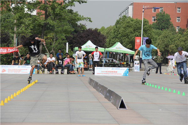 本网讯(学生记者 马闵,摄影 陈亮)为了促进安徽省各高校轮滑爱好者的交流,进一步推广轮滑运动。5月28日,安徽省“大学生活力运动季”首届高校轮滑交流赛在我校图书馆广场和篮球场举行。参赛选手共有200多人,分别来自安徽大学、安徽财经大学、黄山学院等31所大学。全国锦标赛暨世界锦标赛选拔赛花式刹停冠军赵振华来我校观看了比赛。我校轮滑社的吴月婷、潘晓敏、张紫薇及尹浩、郭泽贵,施小鹏分获新人速滑3×200米接力赛女子组和男子组第二名。