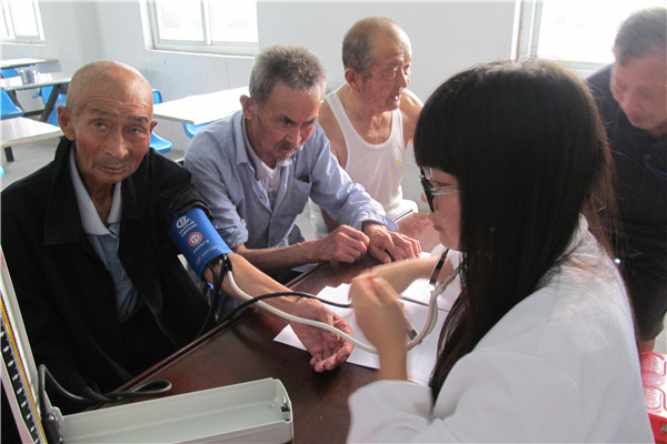 杨店敬老院是一所公益性福利单位,在这里居住了100多名“五保户”孤寡老人。敬老院医疗条件有限,同学们根据自己的专业所学,为老人们量血压、测量血糖、称体重,并记录详细数据。老人们非常开心,也主动配合我们,在敬老院院长的协调下,老人们在食堂里排起长队,耐心等待同学们帮忙测量血压等。