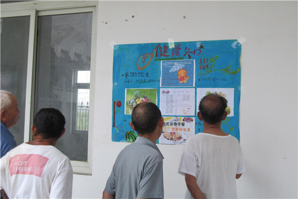 在敬老院的墙上,同学们贴上之前精心准备的一些健康知识宣传海报,老人们也围观起来,并称赞他们画得好。