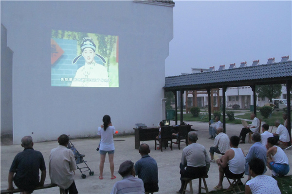 到了晚上,同学们放映了专门为老人们准备的庐剧《小辞店》、抗日剧《琅琊山五壮士》,大大的投影映在敬老院的白墙上,老人们吃完晚饭都围坐在院子里观看,时不时发出喝彩声。