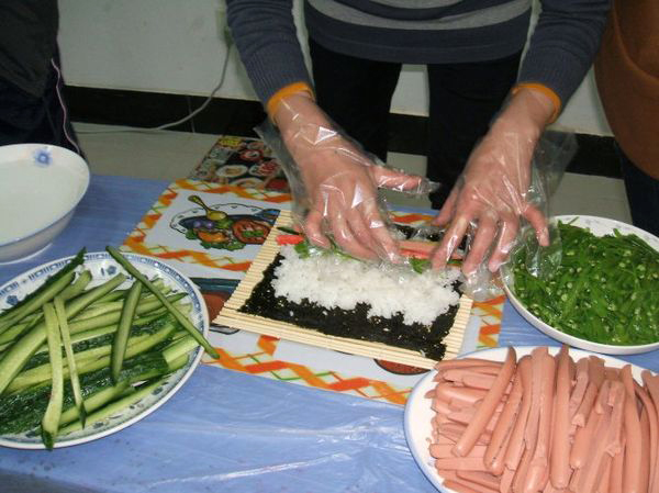 晚上6时许,一年一度的寿司宴在同学们的期待中拉开了序幕。外籍教师首先介绍日本的寿司文化,一个个内涵丰富的典故把同学们的思绪带入悠久的历史长河。接下来,外籍教师简单介绍了寿司的制作材料,并详细讲解了制作的方法。