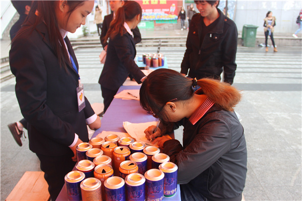 为了吸引同学们,格桑花工作站的同学们将易拉罐摆成爱心形状。华园学子可以以个人、班级、寝室的名义认领爱心易拉罐,将平时不用的零钱投入易拉罐中。两个月后工作站的成员将进行回收、整理。在听完本次活动的意义后,现场很多同学都纷纷认领了爱心易拉罐。文化与新闻传播学院2014级新闻学的何家宝说:“公益活动需要大家一起参与,我只想尽自己一点点的爱心去帮助西部的孩子们,传播正能量。”
