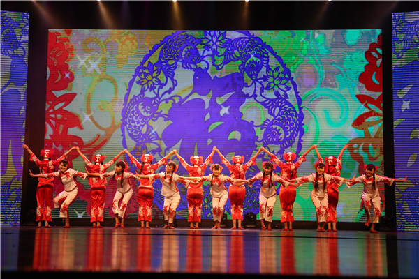 剪纸姑娘欢快喜庆的舞蹈风格给现场观众留下了深刻的印象。伴随着音乐的节奏,舞者们翩翩起舞,手上不停的变换着动作,而这些动作又无一不在展示剪纸的过程。她们时而分散,时而聚拢,精彩的表演得到了观众的热烈掌声与喝彩。一曲终了,这群可爱的姑娘再次围拢在了一起,摆出了各种不同的姿势,组合成一个美丽的剪纸图案,再一次完美诠释了中国民间传统艺术——剪纸。