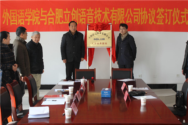 本网讯(柯秀青)为加强应用型人才的培养,改善教学实践条件,12月23日上午,外国语学院与合肥立创语言技术有限公司举行实习实训基地建设签字仪式暨人才培养基地揭牌仪式。副院长杨世国教授应邀出席,合肥立创语言技术有限公司总经理武博和许有江教授出席签约揭牌仪式。外国语学院院长任静生教授带领中层管理人员及师生代表参加仪式。