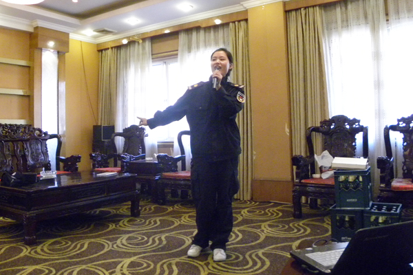 中午十一时,大家齐聚裕森大酒店。按照活动议程,学生护校队队长对护校队2010年度工作做了简要总结。随后,保卫处处长王南贵在讲话中充分肯定了护校队2010年工作所取得的成绩,并对护校队工作提出了几点希望。一是加强业务知识学习,二是牢固掌握值勤技能,打牢队伍根基,三是做好“传、帮、带”作用,四是认真值好每个班次,在岗一分钟干好六十秒。最后队员们纷纷上台表演节目,展现风采,在欢快的笑声中结束了此次活动。