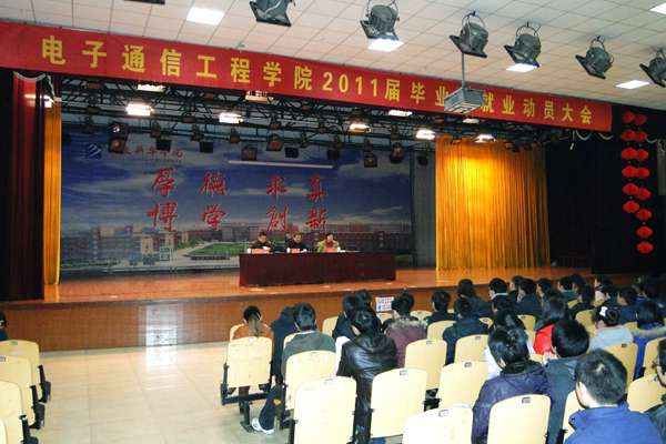 12月14日,电子通信工程学院2011届本科毕业生就业动员大会在学院大礼堂隆重举办,电子通信工程学院教学副院长江晓淮、行政副院长操宏华出席大会,部分本科毕业生参加了动员大会。