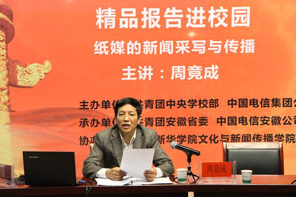 本网讯(通讯员:孙鹏飞)3月31日下午,文化与新闻传播学院特邀《中国战略新兴产业》杂志驻安徽记者站站长、《中国经济导报》驻安徽记者站常务副站长、《祖国》杂志特刊部主任,高级记者周竟成为我校师生作了一场题为“纸媒的新闻采写与传播”的学术报告。此次报告由共青团中央学校部主办,共青团安徽省委承办,文化与新闻传播学院协办。文化与新闻传播学院院长助理孙鹏飞、新闻系主任许宪章教授以及部分学生代表参加了报告,报告由许宪章主持。