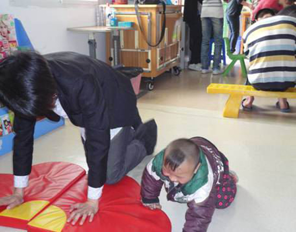 还有一个3岁的小男孩,腿脚都被支架螺丝固定着,没办法正常行走。可是他又特别活泼,喜欢一下到这儿,一下去那儿。孩子的妈妈非常的辛苦,只要孩子一闹,就得抱着他换个地方。和小男孩的妈妈交流之后,柯斌抱着小男孩去阅读区,那里摆放着好多少儿读物,地面上也是泡沫地板。他把小男孩放在地板上,带着小男孩一起爬。开始小男孩还不太会,他们就一起绕着书柜爬。几天之后,小男孩像只欢快的兔子,在书柜间地面穿来穿去,非常的开心。