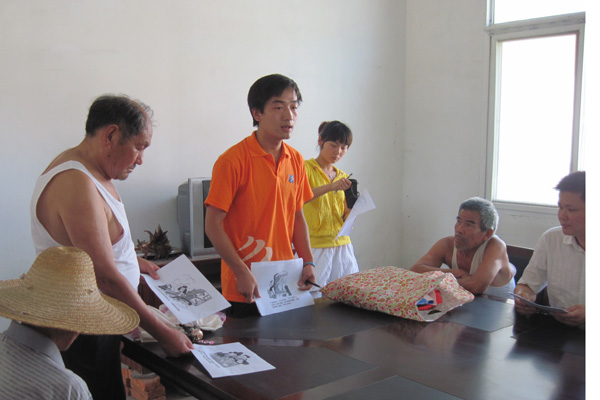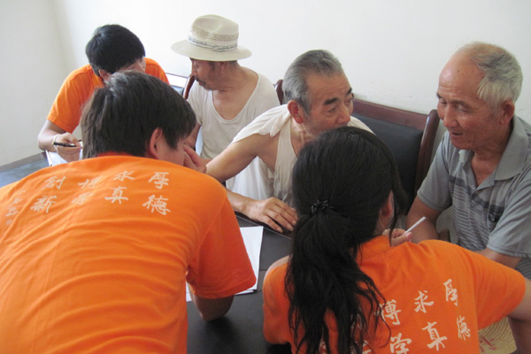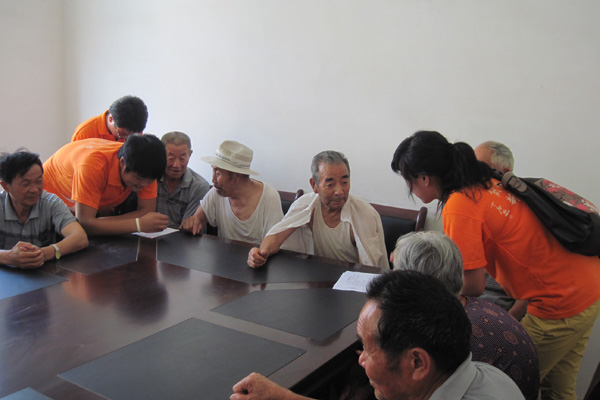 (志愿者和老人交流了解他们生活情况)