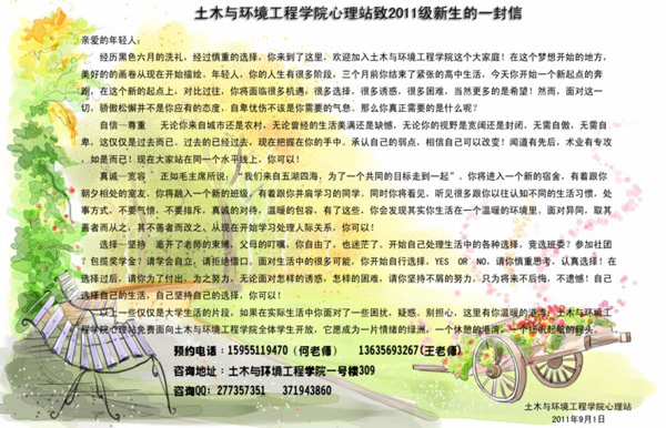 为了让刚刚进入陌生环境的新生更好的融入大学生活,学会面对和处理在适应新环境中的可能产生的各种情绪和心理困惑,土木与环境工程学院心理站给全体2011级新生写了一封温暖的欢迎信。