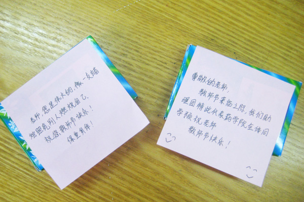 教师节前夕,各班级、学生会及助理团等早早地做好了准备,要给老师们一个意外的惊喜。助理团的同学早早在教学楼门上贴了一副对联以表达自己对老师的敬爱之情。他们还派专人代表学院向每位老师赠送了金嗓子喉片,并细心地贴上了自己的祝福卡片。学生会的同学们给老师们送上了一个小蛋糕,祝愿老师节日快乐,永远年轻。